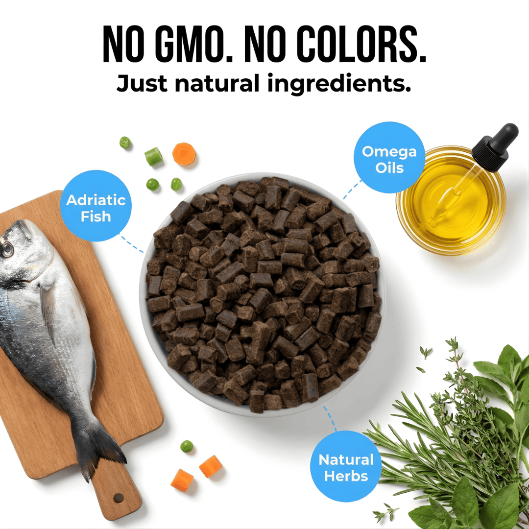 Dehydrated Adriatic fish (30%), dried sweet potatoes, dried potatoes, Adriatic fish oil (10%), oat flakes (8%), corn flakes, dried pumpkin (2%), dried carrot (1.2%), flaxseed, chicory extract (source of inulin), dried herbs (0.2%), beta-glucans,vitaminand mineral mixture.